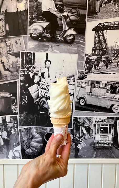 Con dulce de leche y helado, decorado con crema. Consultar disponibilidad y variedades